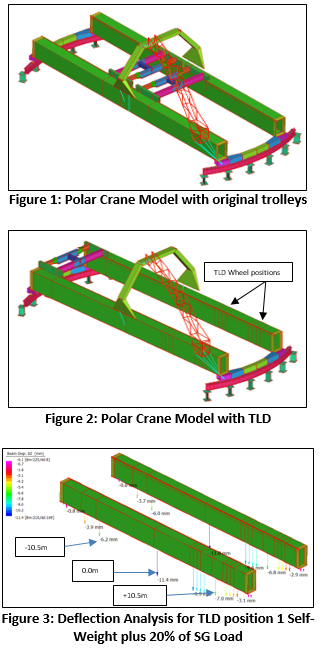 • Figure 1 represents the Polar Crane with the original trolleys. Figure 2 represents the Polar Crane with the Temporary Lifting Device (TLD) modelled only by its wheel positions